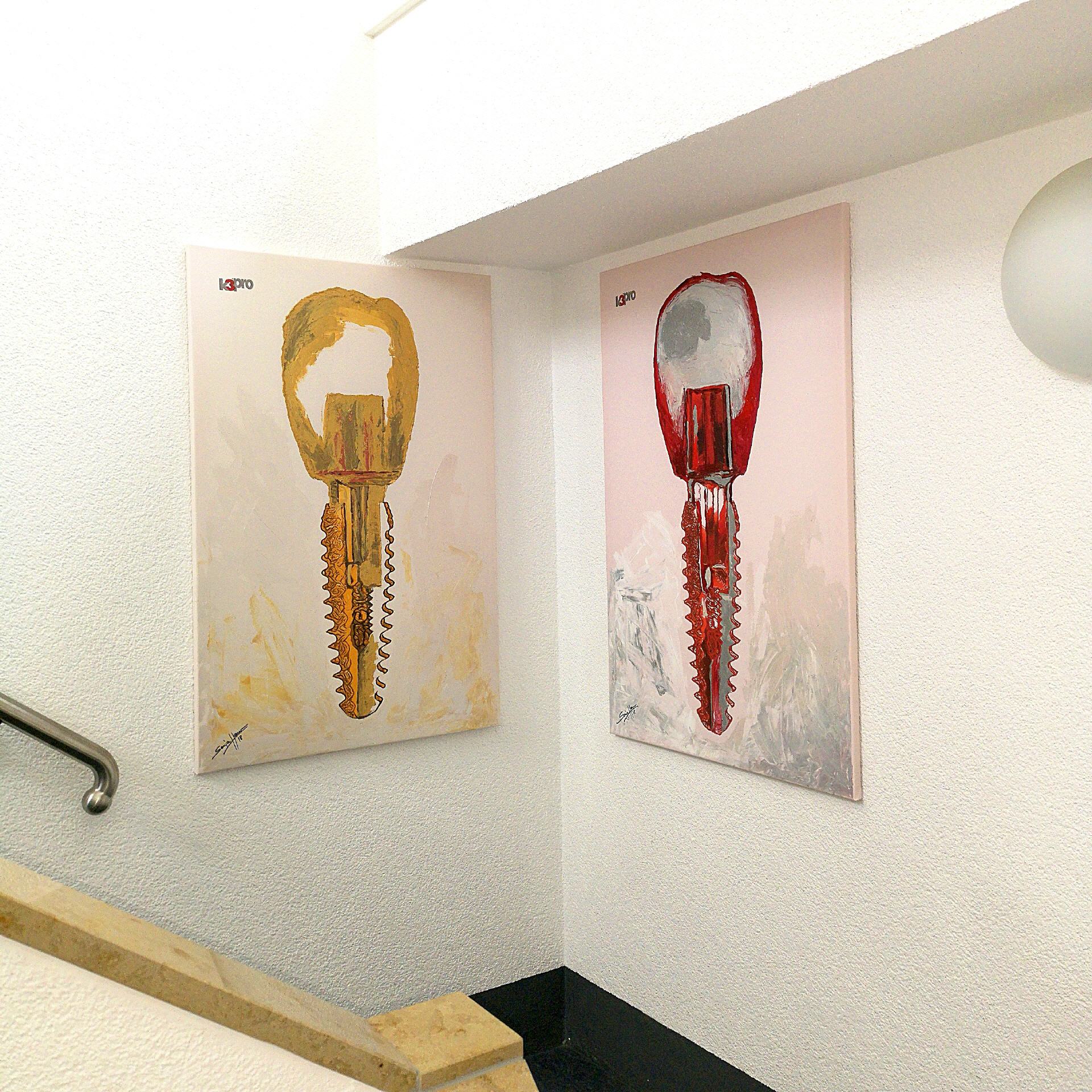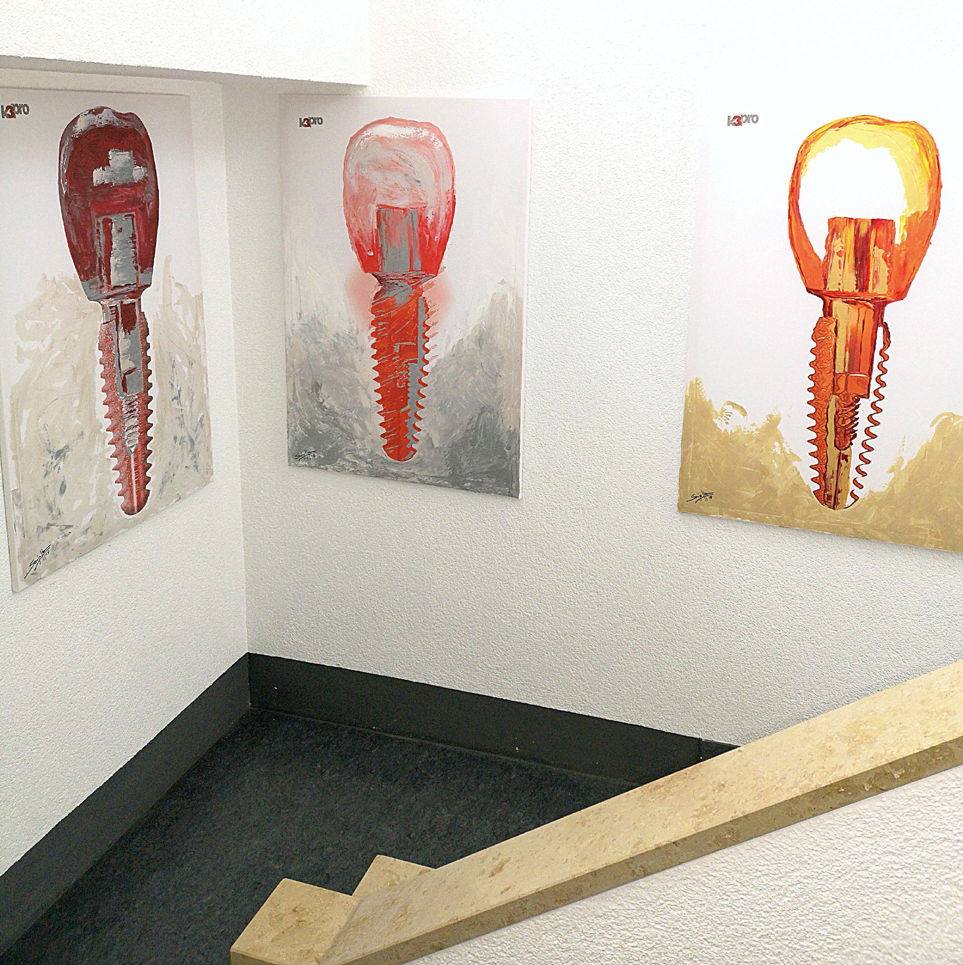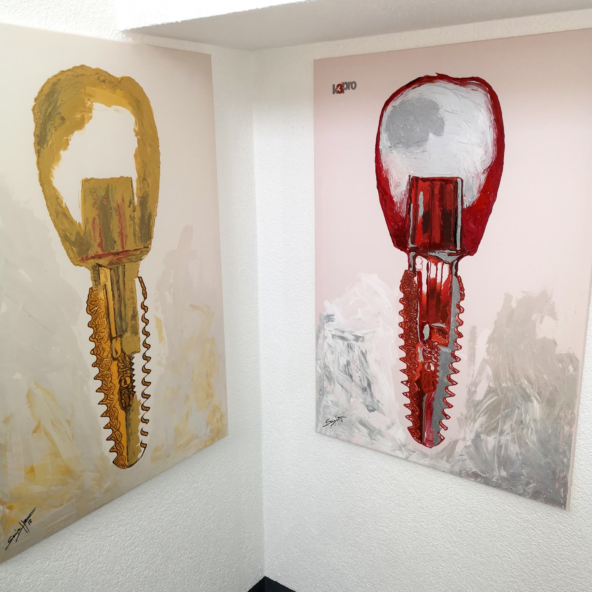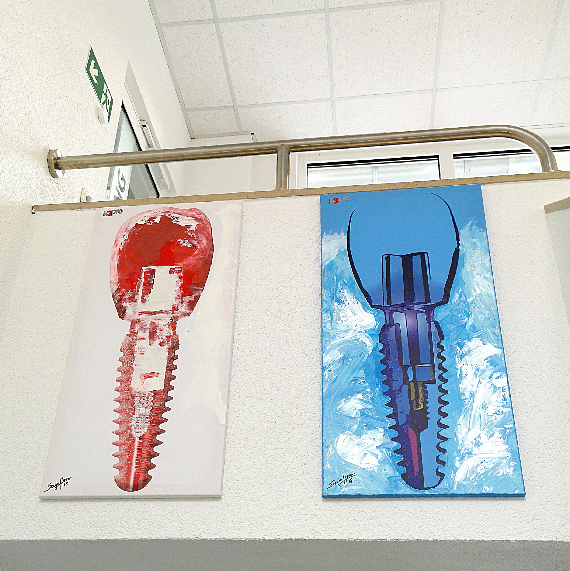 Die konzeptionelle Entwicklung dieser individuellen Exponate entstand in Zusammenarbeit mit dem internationalen Implantat Hersteller ARGON aus Bingen am Rhein. Die Künstlerin Sonja Henn setzte sich im speziellen mit dem Thema K3PRO Implantat auseinander. Die entstandenen Kunstwerke – jedes ein UNIKAT – wurden anhand des Originalbildmaterials des K3PRO Implantats fotodesignd und farblich verändert. Die eigentlichen 3-6mm großen Titanimplantate zeigen sich in neuen Farben und übergroßen Dimensionen. Dennoch bleibt der ursprüngliche Karakter unangetastet. Die Fotokunst wird auf Leinwand gebracht und partiell mit Acryl- und Ölfarbenfarben individuell mit Spachteltechnik von der Künstlerin bearbeitet.